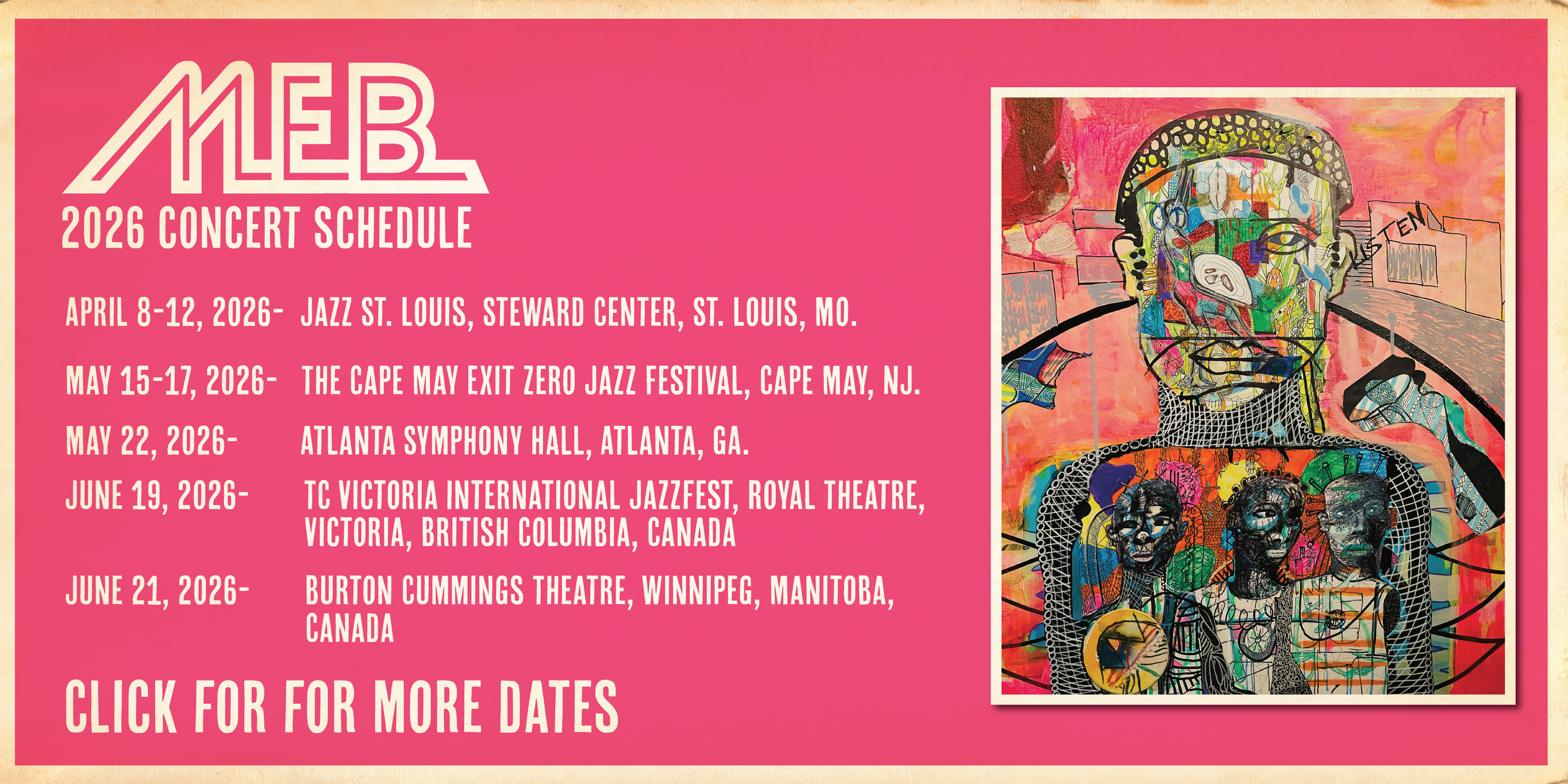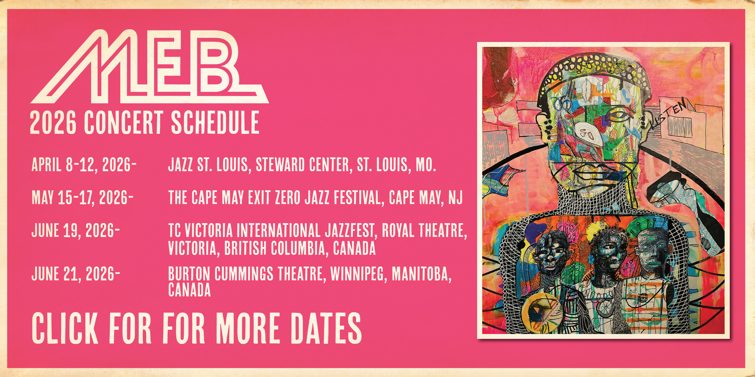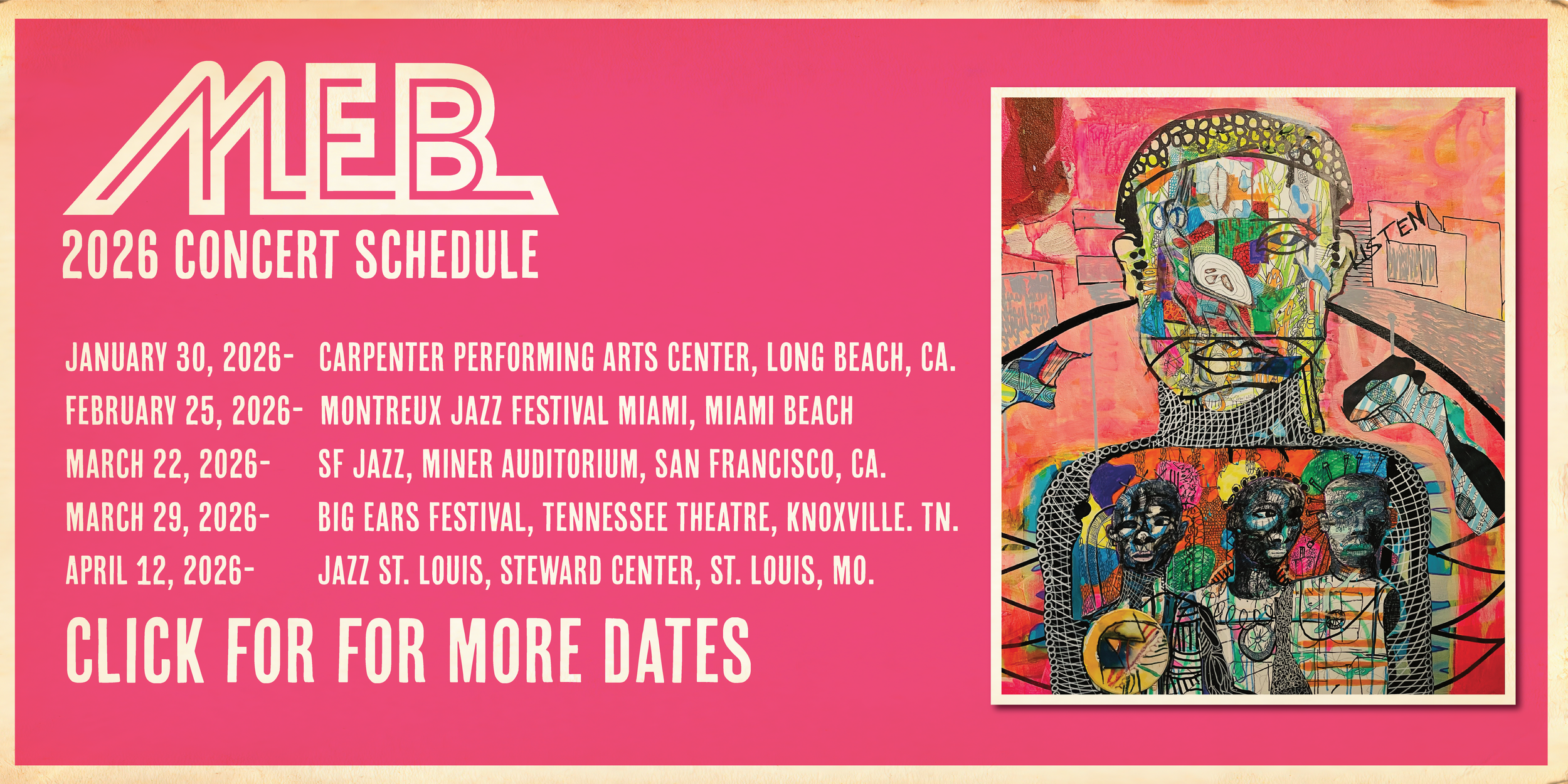 M.E.B. (formerly Miles Electric Band) is a progressive All-Star ensemble featuring Miles Davis alumni revises the framework for modern jazz improvisation. The avant-garde collective revisits repertoire from Davis’ electric period to pay homage to The Chief. The band represents two generations of players: Davis’ contemporaries and the next generation of music all stars. This is a rotating ensemble of master musicians. The highly eclectic group was put together by EMMY and GRAMMY AWARD WINNING producer/drummer Vince Wilburn, Jr., with the intention to continue expanding the boundaries of music, while also paying homage to the classics.